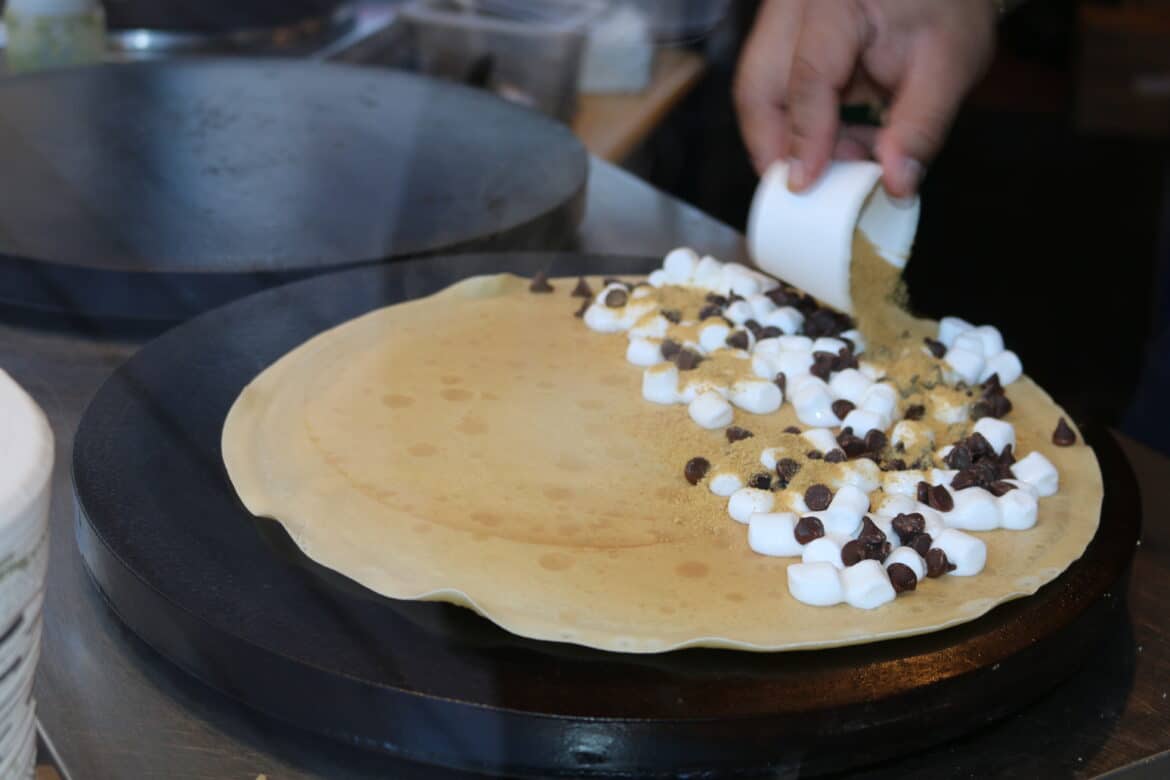 - Grab a dessert crepe to split from the Crepe Cafe and enjoy it while listening to some live music or watching a performance.