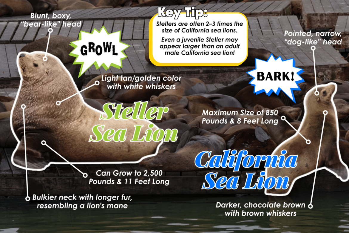 Like California sea lions, Steller sea lions are very social animals. They are known to share rookeries and haul outs with California sea lions, so hauling out on the docks together is normal behavior for them.