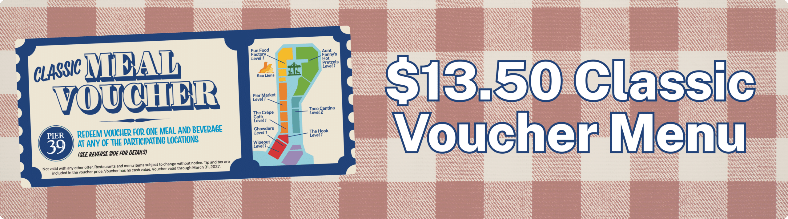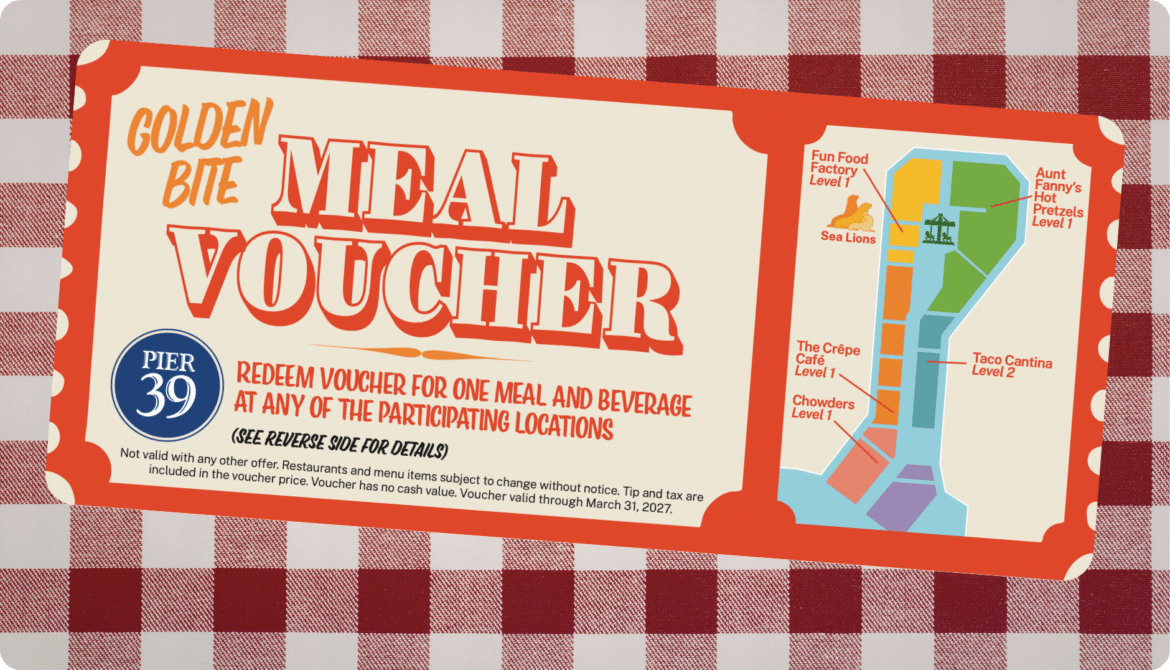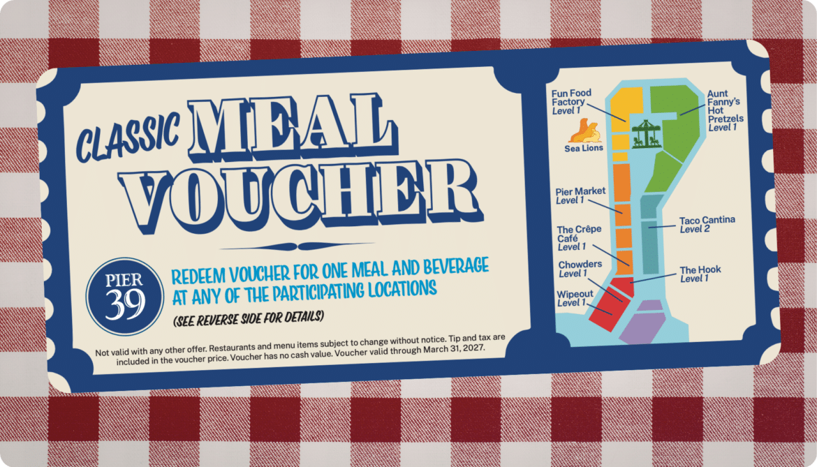 For on-the-go groups looking for dining flexibility, choose the PIER 39 Pre-Paid Meal Voucher Program!