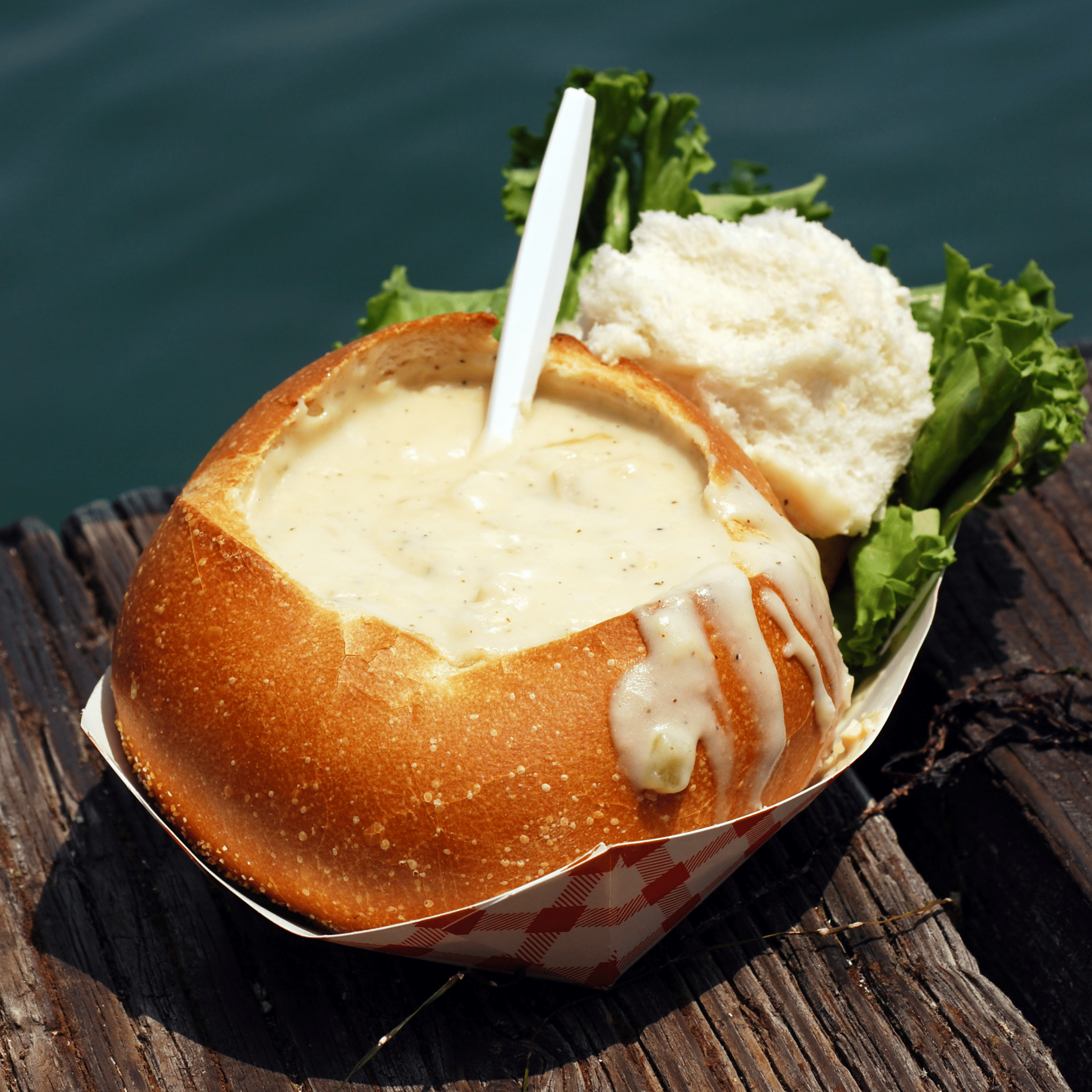 Choice of clam chowder served in a sourdough bread bowl OR Stagg Chili served in a sourdough bread bowl OR fish & chips. Includes a medium soft drink.